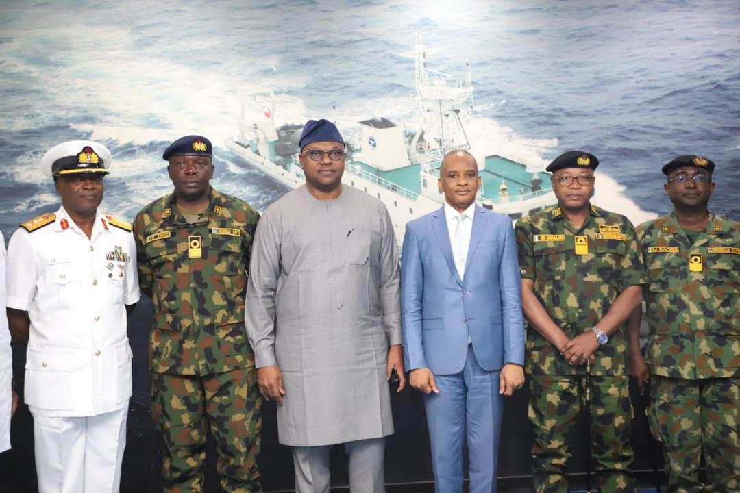L-R: Maritime Guard Commander (NIMASA), Commodore AA Gaya; Acting Fleet Commander, Western Naval Command and Commander Deep Blue Project, Commodore Victor Choji; Executive Director, Maritime Labour and Cabotage Services, NIMASA, Engr. Victor Ochei; Director General NIMASA, Dr. Bashir Jamoh, OFR; Flag Officer Commanding (FOC), Western Naval Command, Rear Admiral Mohammed Abdullahi and Commodore Gideon Kachim, during a courtesy visit by the FOC to the NIMASA Headquarters in Lagos…recently.